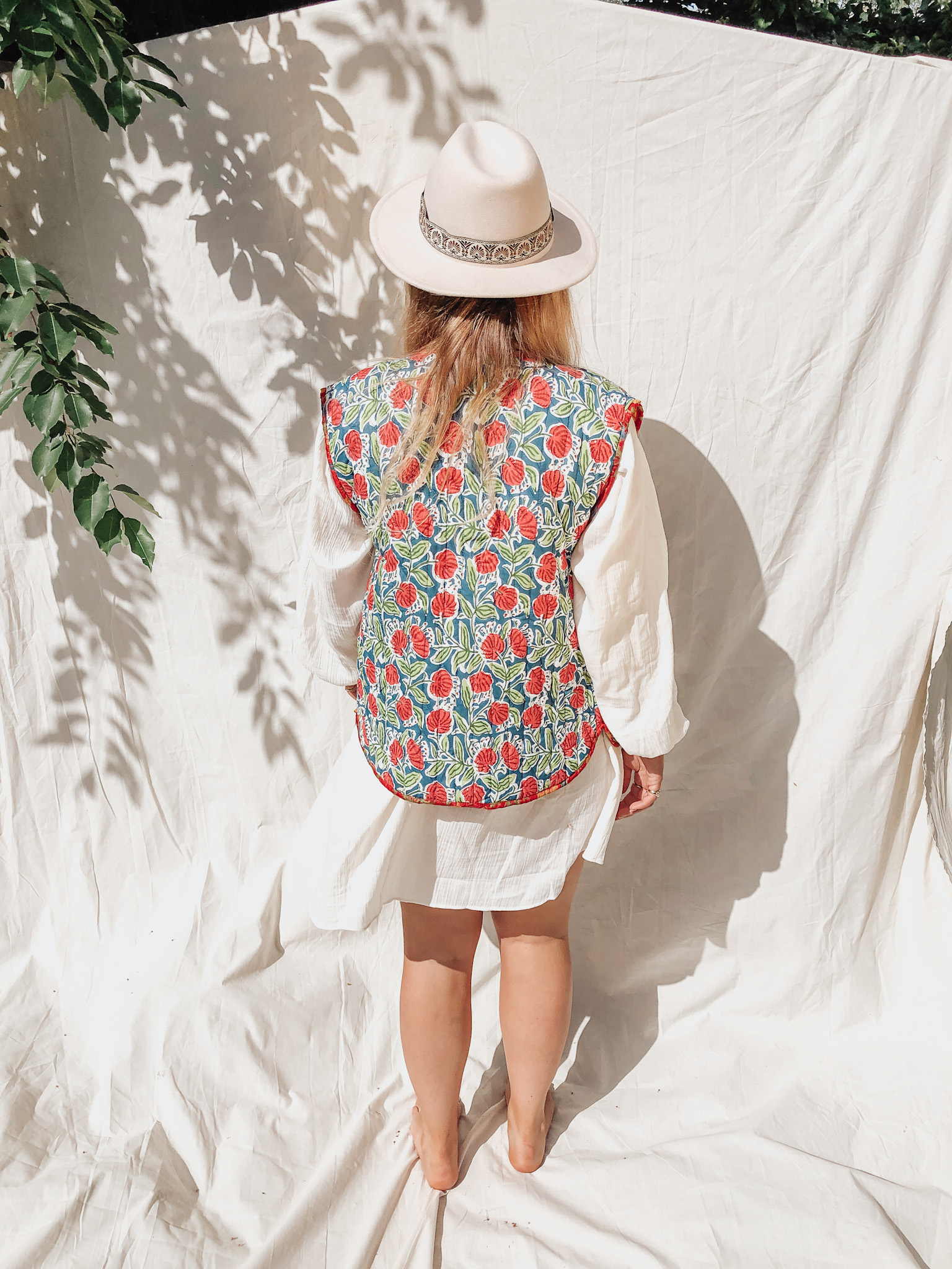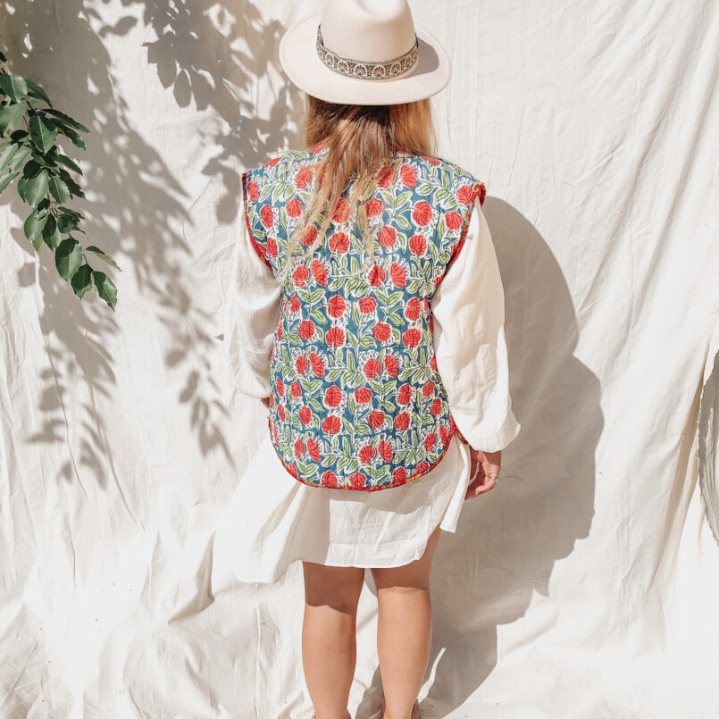 Please note: our reversible waistcoats are made of upcycled vintage saris. These saris have been worn by Indian woman in the past and carry a history. Despite our careful selection of only the best vintage fabrics, small imperfections may occur.